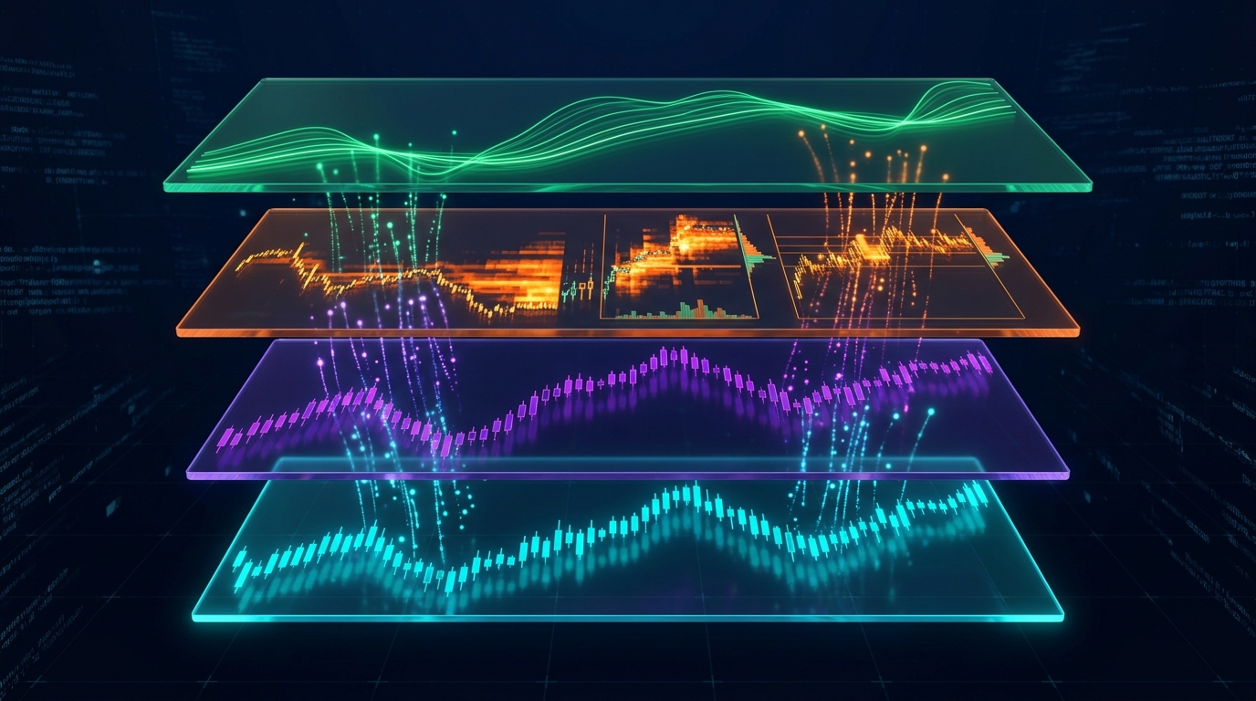 Layer 3 (microstructure): Volume imbalance bars + delta bars from the raw trade stream for detecting informed flow, order splitting, and anticipating large moves. See also Digital Fingerprint: Trader Identification for behavioral pattern recognition on order flow data.
