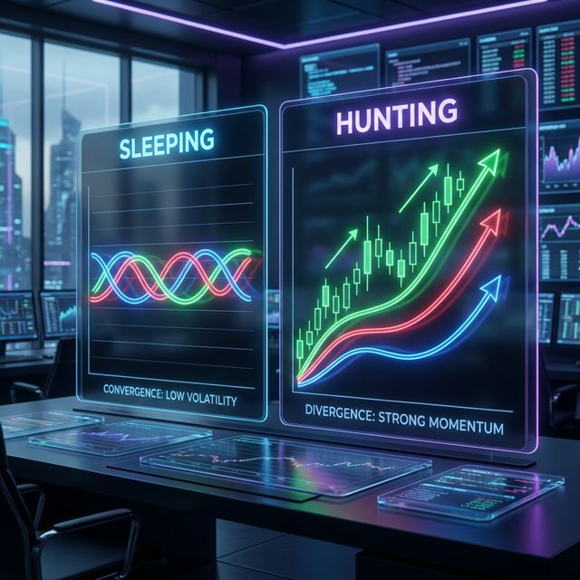 The two primary states of the Alligator: 'Sleeping' during flat consolidation and 'Hunting' during strong trending momentum
